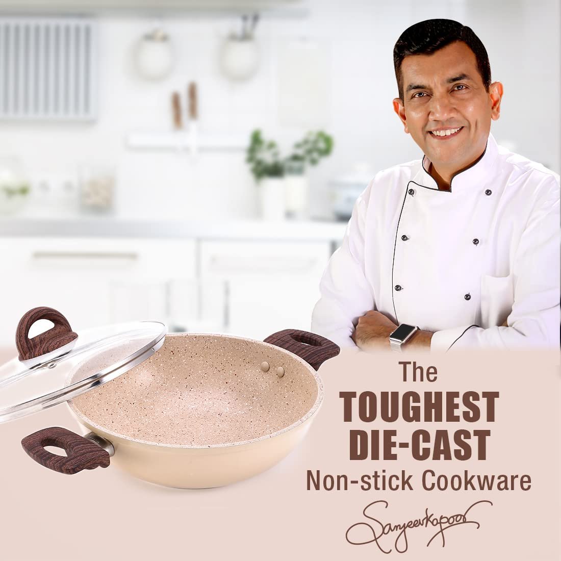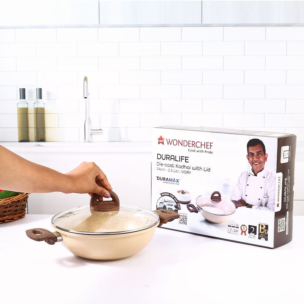 Wonderchef Duralife Die-cast 24 cm Kadhai with lid|5 Layer Healthy Duramax Non-Stick Coating|Soft Touch Handles|Pure Grade Aluminium | PFOA Free | 2.5 litres | 2 Year