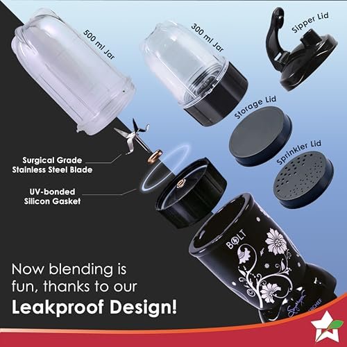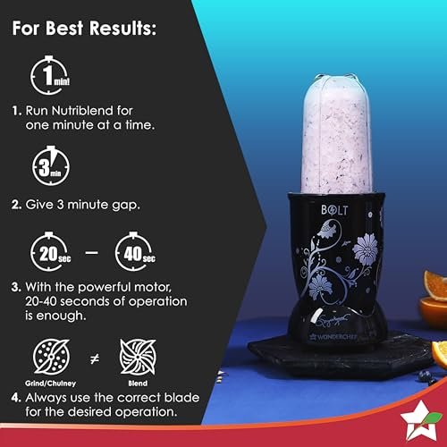PERFORMANCE WITH STYLE & 50% EXTRA POWER: Nutri-blend is India’s best-selling mixer-grinder-blender thanks to its powerful motor, beautiful looks, unbreakable transparent jars and awesome performance. And now with Nutri-blend BOLT, you have 50% extra power, 600W large sized motor and even better results. Due to its compact frame, the power to weight ratio is so favorable that it delivers a performance equivalent to a normal mixer-grinder of 1000W. ALL IN ONE: The NB-BOLT is a complete system – start with 2 jars, and keep adding the large mixing jar, the chopper, juicer & food processor attachments as your needs evolve. The jars and attachments in BOLT are the same as normal Nutri-blend, so you can easily upgrade from one to another. All are available on our website. It also has a special sipper lid that can be attached to jar, so make your smoothie / shakes in the jar and carry it along. SPECIALISED FUNCTIONS: Grind everything within 30 seconds in the Tall Jar (500ml) that comes with 4-wing blade for mixing-blending and the Short Jar (300ml) with 2-wing flat blade for grinding to make all kinds of chutneys, shakes, smoothies and masalas. SUPER SHARP STAINLESS STEEL BLADES: The surgical grade steel blades grind hardest ingredients and yet stay sharp. They extract immunity enhancing anti-oxidants, pain relieving Omega 3s, proteins, vitamins & minerals from your foods. Cleaning is super-easy because the blades are right on top when you unscrew the jar-base, unlike in normal mixers where the blades are at the bottom of the jar. 2 YEAR WARRANTY & AFTER SALES SERVICE: Reliable Wonderchef warranty with the best after sales service in 12,000 pin codes across India. Buy Spares & Accessories on Amazon.