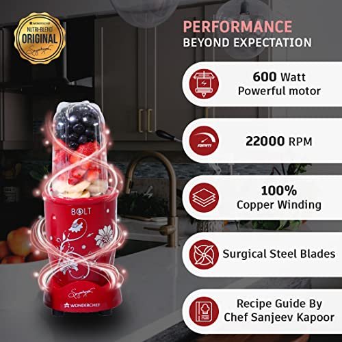 PERFORMANCE WITH STYLE & 50% EXTRA POWER: Nutri-blend is India’s best-selling mixer-grinder-blender thanks to its powerful motor, beautiful looks, unbreakable transparent jars and awesome performance. And now with Nutri-blend BOLT, you have 50% extra power, 600W large sized motor and even better results. Due to its compact frame, the power to weight ratio is so favorable that it delivers a performance equivalent to a normal mixer-grinder of 1000W. ALL IN ONE: Like Nutri-blend, the NB-BOLT is also a complete system – start with 2 jars, and keep adding the large mixing jar, the chopper, juicer & food processor attachments as your needs evolve. The jars and attachments in BOLT are the same as normal Nutri-blend, so you can easily upgrade from one to another. All are available on our website. It also has a special sipper lid that can be attached to jar, so make your smoothie / shakes in the jar and carry it along. SPECIALISED FUNCTIONS: Grind everything within 30 seconds in the Tall Jar (500ml) that comes with 4-wing blade for mixing-blending and the Short Jar (300ml) with 2-wing flat blade for grinding to make all kinds of chutneys, shakes, smoothies and masalas. The speed-breakers inside the jars ensure proper grinding of the hardest spices and ensures smoother chutneys than any other grinder. SUPER SHARP STAINLESS STEEL BLADES: The surgical grade steel blades grind hardest ingredients and yet stay sharp. They extract immunity enhancing anti-oxidants, pain relieving Omega 3s, proteins, vitamins & minerals from your foods. Cleaning is super-easy because the blades are right on top when you unscrew the jar-base, unlike in normal mixers where the blades are at the bottom of the jar. 2 YEAR WARRANTY & AFTER SALES SERVICE: Reliable Wonderchef warranty with the best after sales service in 12,000 pin codes across India. Buy Spares & Accessories on Amazon.