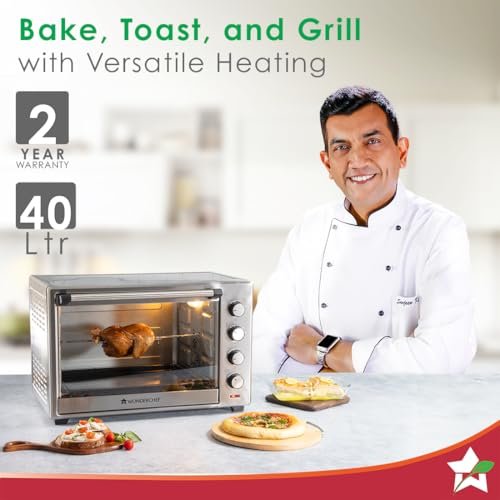 Bake delicious cakes, loaded pizzas, and the softest breads; roast chicken, grill vegetables and introduce a variety of new dishes in your kitchen conveniently Equipped with rotisserie function for cooking delicious tandoori dishes High-efficiency stainless steel heating elements help evenly toast, bake, brown and reheat to perfection Auto-shut off timer function with ready bell to prevent over-cooking and under-cooking Heat-resistant tempered glass window can withstand high temperature & is safe to use Removable crumb tray for easy cleaning Inside lamp for clear visibility throughout the cooking process Ideal convection mode for faster, uniform cooking & browning High temperature control range up to 250 degrees to cook any dish Open your kitchen to a whole new world of quick, easy and smart cooking like a Masterchef every day! Cooking capability: Baking, Grilling, Toasting; Heat-resistant tempered glass window Includes OTG, Chromed wire rack, Baking and grilling tray and tray handle Capacity: 40 litres, Dimensions: 53.5*38*33.5 cm Power Consumption: 220-230V~50Hz; Warranty: 2 years Material: Stainless Steel; Heating Type: Grill + Convection and Control Type: Rotating Knob; Heating element selector: top, bottom, sides Wonderchef products are inspired by Italian Design and adhere to German Quality Standards. They are covered by Reliable Wonderchef Warranty, T&C apply