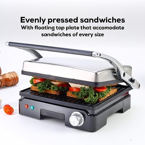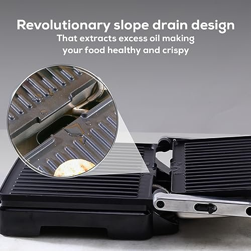 ADJUSTABLE SLOPE TO REMOVE EXCESS OIL: The Sanjeev Kapoor Tandoor Standard Size (SKT) electric griller & sandwich maker lets you adjust the slope to control the amount of oil used in your dishes, promoting healthier cooking by draining excess oil.Enjoy almost oil-free cooking with the SKT without compromising on taste. Prepare healthy and delicious dishes in the comfort of your home. VERSATILE COOKING (3-in-1) : This mini appliance offers versatile cooking options, allowing you to Grill, Toast and Roast a variety of delicious dishes with ease. 180° OPENING: Experience the joy of crispy and crunchy food with the SKT’’s 180° grilling capability & utilize both sides of the electric tandoor. Perfect for Aloo Tikkis, Paneer Tikka, Pizza, Panini and simultaneous grilling of Patties and Buns. FLEXI-HINGE: The Sanjeev Kapoor Tandoor Standard Size (SKT) features a flexi-hinge that adjusts according to the height of the food, ensuring even cooking of thick items like sandwiches. Enjoy perfectly cooked meals every time. THERMOSTAT: Enjoy precise temperature control with the SKT’s 10-step thermostat control. From low to high heat, adjust the temperature for perfect cooking conditions and prevent overheating.The SKT also features superfast heating, allowing you to prepare meals quickly and save time in the kitchen. LED INDICATOR: The red color indicates dark browning, while green indicates light browning. Achieve the desired level of browning for perfectly cooked food. OIL COLLECTOR TRAY: The SKT includes an oil collector tray that efficiently removes excess oil, making your dishes healthier and reducing mess.