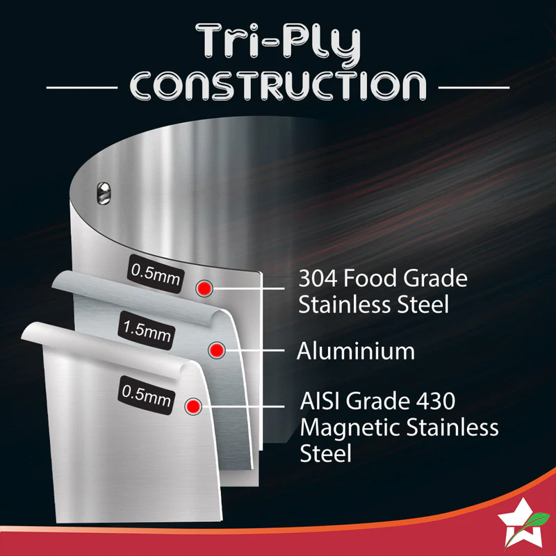 - A layer of aluminium is sandwiched right through, even at the sides, between two layers of high-grade steel. The steel is superior food-grade,18/8 stainless steel on the inside and 430 on the outside, making the pan highly heat conductive and induction friendly